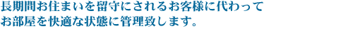 お住まいを、主にセカンドハウスとしてご利用になるお客様や、長期間留守にしなければならないお客様の、お部屋の鍵をお預かりし、お客様の留守中のお住まいの管理を代行するサービスです。